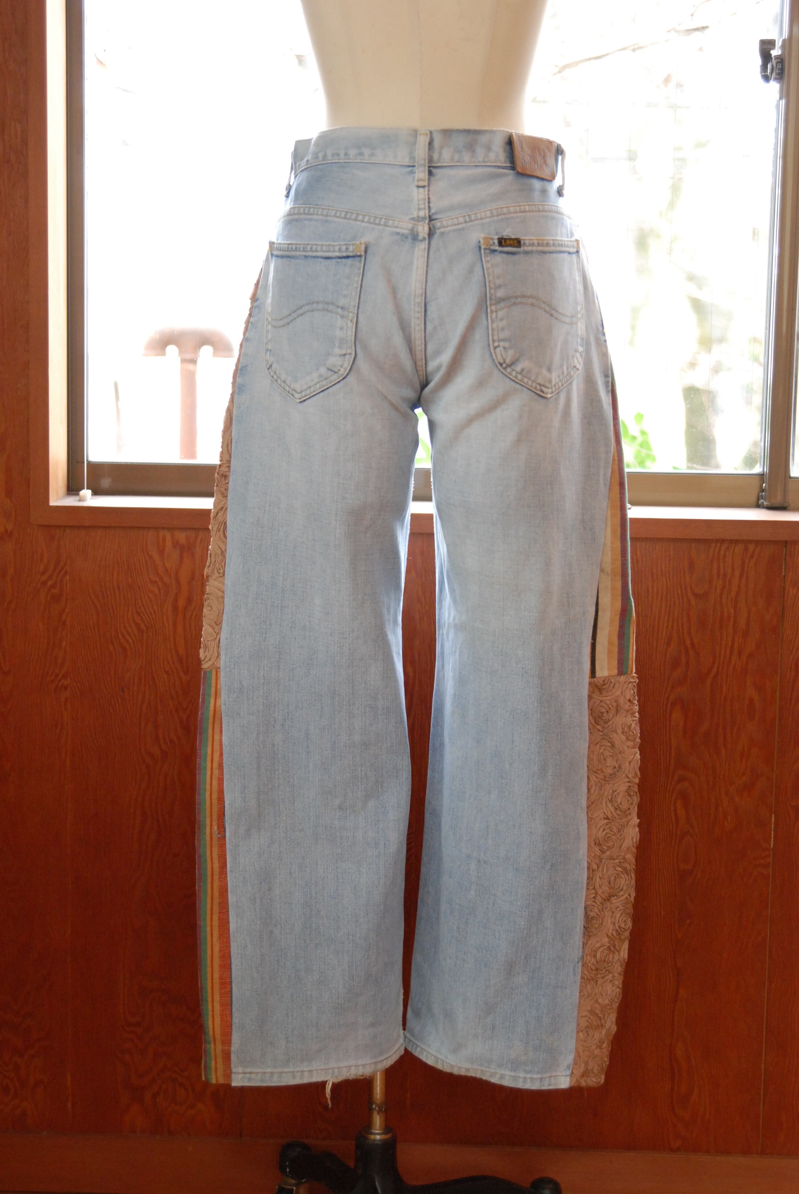 Reworked denim / Lee Riders light blue jeans w/ French vintage stripe& antique ribbon detailed flower fabric / size 29 inch